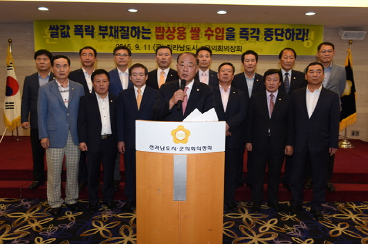 Àü³² ½Ã¡¤±ºÀÇȸÀÇÀåȸ´Â "½Ò °ª Ç϶ôÀ¸·Î °íÅë¹Þ´Â ³ó¹ÎµéÀÌ Èñ¸ÁÀ» °®°í ¿µ³ó¿¡ Á¾»çÇÒ ¼ö ÀÖµµ·Ï Á¤ºÎ°¡ ¹ä»ó¿ë ½Ò ¼öÀÔÀ» Áï°¢ Áß´ÜÇϰí, ³óÃÌ¡¤³ó¾÷À» »ì¸®±â À§ÇÑ ½ÇÈ¿¼º ÀÖ´Â ´ëÃ¥À» ¸¶·ÃÇØ Àû±Ø ÃßÁøÇØ ÁÙ °ÍÀ» °·ÂÈ÷ Ã˱¸ÇÑ´Ù"°í °Á¶Çß´Ù.