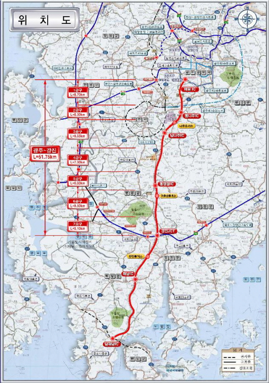 ÀÌ¿Í ÇÔ²², ±¤ÁÖ ¼±¸¿Í ³²±¸ ´ëÃÌ¿¡ µé¾î¼´Â µµ½Ã÷´Ü»ê´ÜÀ» ºñ·ÔÇÑ ³ªÁÖ, ¿µ¾Ï, °Áø µî Àü³² ³²ºÎ±ÇÀ» Á÷Á¢ ¿¬°áÇÏ´Â °í¼Óµµ·Î¸ÁÀÌ È®ÃæµÅ ³«ÈÄÁö¿ªÀÇ ±¹°¡ °£¼±µµ·Î¸Á ¿¬°è ±â´ÉÀ» °ÈÇϴµ¥µµ ÇѸòÀ» ÇÏ°Ô µÆÀ¸¸ç, Á¤ºÎ´Â ´çÃÊ, ³ªÁÖ~¿Ïµµ °£ 66.3§°¸¦ ÃßÁøÄÚÀÚ ÇßÁö¸¸, ±¤ÁÖ¿Í Àü³²ÀÇ ÇàÁ¤ Á¤Ä¡±ÇÀÌ ¸ðµÎ ÈûÀ» ¸ð¾Æ Áß¾ÓºÎó¸¦ »ó´ë·Î Áö¼ÓÀûÀÎ ¼³µæ ÀÛ¾÷À» ÆîÄ£ °á°ú Áö³ 2007³â5¿ù ±âȹÀçÁ¤ºÎ°¡ ±¤ÁÖ±îÁö ±¸°£ ¿¬ÀåÀ» ½ÂÀÎÇÑ ¹Ù ÀÖ´Ù.