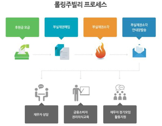 ·Ñ¸µ ÁÖºô¸®´Â ½Ã¹Î°ú ±â¾÷µé·ÎºÎÅÍ ¼º±ÝÀ» ¸ð¾Æ ºÎ½Çä±ÇÀ» ¸ÅÀÔÇÑ ÈÄ ¼Ò°¢ÇØ Ã¤¹«ÀÚµéÀÇ ºúÀ» ÅÁ°¨Çϰí, À̵éÀÌ ½º½º·Î ÀÏ¾î¼ Á¤»óÀûÀÎ °æÁ¦È°µ¿À» Çϵµ·Ï À繫»ó´ã°ú °æÁ¦±³À°À» ÁøÇàÇÏ´Â »ç¾÷À¸·Î, Áö³ 2012³â ¹Ì±¹ ½Ã¹Î´Üü ¡®¿ù°¡¸¦ Á¡·ÉÇ϶ó(Occupy Wallstreet)°¡ ½ÃÀÛÇÑ ºú ÅÁ°¨ ¿îµ¿ ·Ñ¸µ ÁÖºô¸®(Rolling Jubilee)¡¯¸¦ ±¤»ê±¸°¡ Áö¿ª¿¡ µµÀÔÇÑ °ÍÀÌ´Ù.