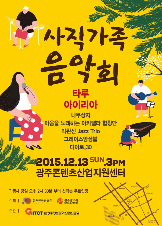 ¹®ÈüÀ°°ü±¤ºÎ¿Í ½Ã°¡ ÁÖÃÖÇϰí (Àç)±¤ÁÖÁ¤º¸¹®È»ê¾÷ÁøÈï¿øÀÌ ÁÖ°üÇÏ´Â À̹ø Çà»ç´Â ¿¬¸»¿¬½Ã¸¦ ¸Â¾Æ ¼¼´ë °£ ¼ÒÅëÇÏ°í ¿Â °¡Á·ÀÌ ÇÔ²² Áñ°Ì°Ô °ü¶÷ÇÒ ¼ö ÀÖ´Â °ø¿¬¹®È Á¤ÂøÀ» À§ÇØ ±âȹµÆÀ¸¸ç, °ø¿¬¿¡¼´Â ¾ÆÄ«Æç¶ó, ÀçÁî, Ç»Àü±¹¾Ç, Ŭ·¡½Ä, ¾îÄí½ºÆ½ µî ´Ù¾çÇÑ À帣°¡ ¼±º¸ÀδÙ. ³ª¹«»óÀÚ, ¸¶À½À» ³ë·¡ÇÏ´Â °¡Á· ÇÕâ´Ü, ¹Ú¿Ï½Å ÀçÁî Æ®¸®¿À, ¾ÆÀ̸®¾Æ, ±×·¹À̽º ¾Ó»óº¼, µð¾ÆÅä.30, Ÿ·ç µî 7°³ÆÀ 42¸íÀÌ Âü¿©ÇÏ¸ç ¼±Âø¼ø ¹«·á ÀÔÀåÀÌ´Ù.