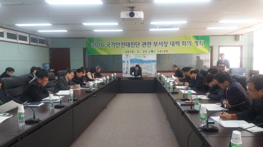 ÇÑÆí, ±¤Áֽô 25ÀÏ ¿ÀÈÄ 2½Ã ½Ãû 17Ãþ Àç³Á¾ÇÕ»óȲ½Ç ´ëÃ¥º»ºÎ ȸÀǽǿ¡¼ ¾÷¹« °ü·Ã ½Ç°úÀå ¹× À¯°ü±â°ü, 5°³ ÀÚÄ¡±¸ ¾ÈÀüºÎ¼ °úÀåÀ» ´ë»óÀ¸·Î 2016³â ±¹°¡¾ÈÀü´ëÁø´Ü ÃßÁø ¹æÇâ°ú Á¡°Ë ¹æ¹ý µî¿¡ ´ëÇÑ ¼³¸íȸ¸¦ ¿°í ¾ÈÀü´ëÁø´Ü ÃßÁø ¹æ¾ÈÀ» ³íÀÇÇß´Ù.