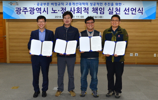 À̳¯ ¼±¾ð½Ä¿¡´Â ±¤Áֽà °ø¹«Á÷³ëµ¿Á¶ÇÕ À§¿øÀå ³ªÀμö, ¹ÎÁÖ³ëÃÑ Àü±¹°ø°ø¿î¼ö³ëÁ¶ ±¤ÁÖÀü³²ÁöºÎÀå ÃÖ¿µÀÏ, ±¤Áֽà ÀÚÄ¡´Üü³ëµ¿Á¶ÇÕ ÀÓ°¡Ãá, ±¤Áֽà »çȸÅëÇÕÃßÁø´Ü ¹Úº´±Ô ´ÜÀåÀÌ Âü¿©ÇØ »çȸ´ëŸÇùÀ» ÅëÇÑ ±¤ÁÖÇü ÀÏÀÚ¸®ÀÇ Çʿ伺¿¡ °ø°¨ÇÏ°í ´ëÈ¿Í Å¸ÇùÀ¸·Î ³ëµ¿ÀÚ¿Í ±¤Áֽð¡ »ó»ýÇÏ´Â ¾ÈÀüÇÏ°í Æòȷοî ÀÏÅ͸¦ Á¶¼ºÇØ °ø°øºÎ¹® ºñÁ¤±ÔÁ÷ °í¿ë°³¼±´ëÃ¥ÀÌ ¼º°øÀûÀ¸·Î ÃßÁøµÇ°í Á¤ÂøµÉ ¼ö ÀÖµµ·Ï »óÈ£ Çù·ÂÇÒ °ÍÀ» ´ÙÁüÇß´Ù.