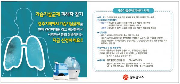 °¡½À±â »ì±ÕÁ¦·Î ÀÎÇØ ÇÇÇØ¸¦ ¹Þ¾Ò°Å³ª ÇÇÇØ°¡ ÀǽɵǴ ½Ã¹Î(À¯°¡Á·)Àº Çѱ¹È¯°æ»ê¾÷±â¼ú¿ø ȯ°æÇÇÇØÁ¶»ç½ÇÀ̳ª ½Ãû ȯ°æÁ¤Ã¥°ú, ÀÚÄ¡±¸ º¸°Ç¼Ò¿¡ ÇÇÇØ ½ÅûÀ» ÇÏ¸é µÈ´Ù. ¹Ú¿µ¼® ȯ°æ»ýű¹ÀåÀº ¡°¿ì¸® Áö¿ª¿¡¼ ´Ü ÇѸíÀÇ °¡½À±â»ì±ÕÁ¦ ÇÇÇØÀÚµµ ¹æÄ¡µÇ¾î¼´Â ¾ÈµÈ´Ù¡±¸ç ¡°±¤Áֽô ÇÇÇØÁ¢¼ö¿Í ÇÇÇØÀÚ Ã£±â¿¡ ÁÖ·ÂÇÏ´Â ÇÑÆí, ÇÇÇØÀÚ¿Í °¡Á·ÀÇ ½É¸®¾ÈÁ¤ Ä¡·á¿Í ¹ý·üÀÚ¹® µîÀ» ÅëÇØ Áö¿ø¿¡ ÃÖ¼±À» ´ÙÇϰڴ١±°í ¸»Çß´Ù.