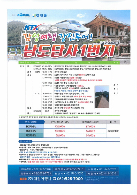 ÄÚ·¹ÀÏ ±¤ÁÖº»ºÎ¿¡¼´Â Áö³ 13ÀÏ ¡®KTX Ÿ°í ¶°³ª´Â °¨¼º¿©Çà °ÁøÅõ¾î! ³²µµ´ä»ç 1¹øÁö¡¯ ¿©Çà»óǰÀ» Ãâ½ÃÇß´Ù. ÀÌ »óǰÀº ÄÚ·¹Àϰú ´ë¿ø¿©Çà»ç°¡ ÁÖ°üÀ¸·Î ¼¿ï¿ë»ê¿ª¿¡¼ Ãâ¹ßÇØ °æ±â±¤¸í¿ª, ÀüºÏÀͻ꿪À» °æÀ¯ÇØ ±¤ÁÖ¼ÛÁ¤¿ª¿¡¼ Àü¿ë ¹ö½º¸¦ Ÿ°í °ÁøÀ» ¿À°¡´Â ¿©Çà»óǰÀ¸·Î KTX¸¦ Ÿ°í ³²µµ¿¡ ³»·Á¿Í ½Åºñ·Î¿î °ÁøÀÇ º¸¹°À» ã°í Ãß¾ïÀ» ¸¸³£ÇÒ °ÍÀ¸·Î ±â´ëµÈ´Ù.