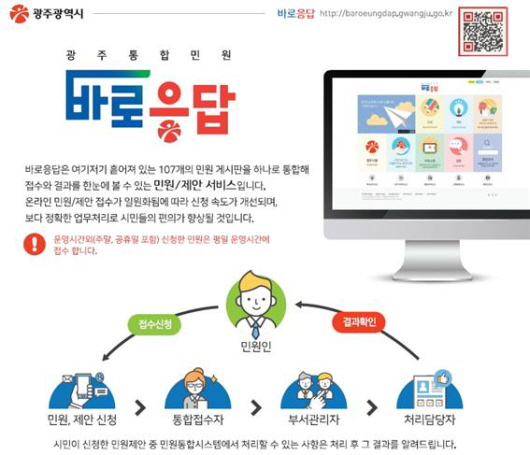 ÀÌÁß ¹Ù·ÎÀÀ´äÀº ±¤Áֽà ´ëÇ¥ ȨÆäÀÌÁö¿Í °¢ »ç¾÷¼Ò ȨÆäÀÌÁö µî¿¡ Èð¾îÁ® ÀÖ´Â 107°³ ¹Î¿ø ¹× Á¦¾È °Ô½ÃÆÇÀ» ÅëÇÕÇØ ½Ã¹Î »ýȰ ¼Ó ºÒÆí»çÇ×À» ÇÑ °÷¿¡¼ Á¢¼öÇØ °á°ú±îÁö º¼ ¼ö ÀÖ´Â ±¤ÁÖÇü ¹Î¿øÅëÇսýºÅÛÀ¸·Î ¹Î¿ø Á¦¾ÈÀÇ Á¢¼ö¿Í ó¸® ½Ã½ºÅÛÀÌ ÀÏ¿øÈµÇ¸é ½Ã¹Î¿¡°Ô ´õ ºü¸¥ °á°ú¸¦ Àü´ÞÇϰí, ´ã´ç °ø¹«¿øÀº °³º° ½Ã½ºÅÛ¿¡¼ ÀÏÀÏÀÌ È®ÀÎÇÏ´Â ºÒÆíÇÔ¿¡¼ ¹þ¾î³ª ÇÑ °÷¿¡¼ È®ÀÎÇϰí ó¸®ÇÒ ¼ö ÀÖ°Ô µÈ´Ù.