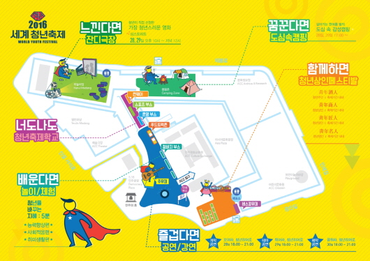 6°³ ¿µ¿ªÀ¸·Î ±¸¼ºµÈ 2016 ¼¼°èû³âÃàÁ¦´Â ÃàÁ¦Àå¿¡ µé¾î¼´Â ¼ø°£ ´©±¸³ª ¿µ¿õÀÌ µÈ´Ù´Â Àǹ̿¡¼ Áñ°Ì´Ù¸é ´©±¸³ª È÷¾î·Î(°ø¿¬), ÇÔ²²ÇÏ¸é ´©±¸³ª È÷¾î·Î(û³â»óÀÎ Æä½ºÆ¼¹ú, û³âÃàÁ¦Çб³), ´À³¤´Ù¸é ´©±¸³ª È÷¾î·Î(Àܵð±ØÀå º°¹ã ¿µÈÁ¦), ²Þ²Û´Ù¸é ´©±¸³ª È÷¾î·Î(µµ½É¼Ó Ä·ÇÎ, Àü±¹ û³âÀÇ ¹ã, ¼¼°è û³âÀÇ ¹ã), ¹è¿î´Ù¸é ´©±¸³ª È÷¾î·Î(û³âÀ» ¹Ù²Ù´Â ÁöÇý 5ºÐ), ³Êµµ³ªµµ ´©±¸³ª È÷¾î·Î(û³â ¿ôÀ½¼î, ¼¼°èû³â ·±´×¸Ç)À¸·Î ÆîÃÄÁø´Ù.