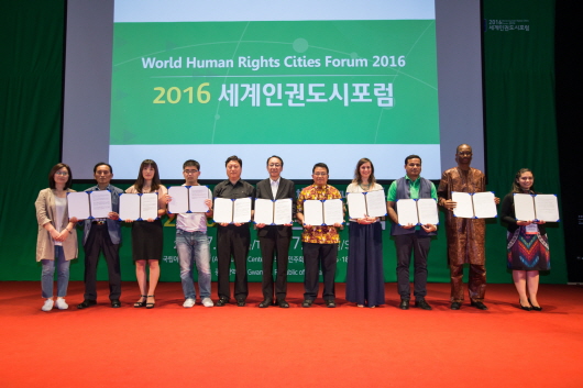 2016¼¼°èÀαǵµ½ÃÆ÷·³ ¼±¾ð¹®¿¡´Â Áö¹æÁ¤ºÎ°¡ ÀαÇÁõÁø°ú Àΰ£´Ù¿î »îÀ» À§ÇÑ Á¤ÁÖȯ°æ Á¶¼ºÀÇ Áß¿äÇÑ Àǹ«ÁÖüÀÓÀ» °Á¶Çϰí, Âü¿©¿Í ÀÚÄ¡, ¸ðµç ±¸¼º¿ø°ú Áö¹æÁ¤ºÎ¿ÍÀÇ °Å¹ö³Í½º¸¦ ÅëÇØ ¸ðµÎ°¡ ÇູÇÑ Àαǰøµ¿Ã¼¸¦ ¸¸µå´Â °ÍÀÌ Àαǵµ½ÃÀÇ ºñÀüÀÓÀ» ¼±Æ÷Çß´Ù.