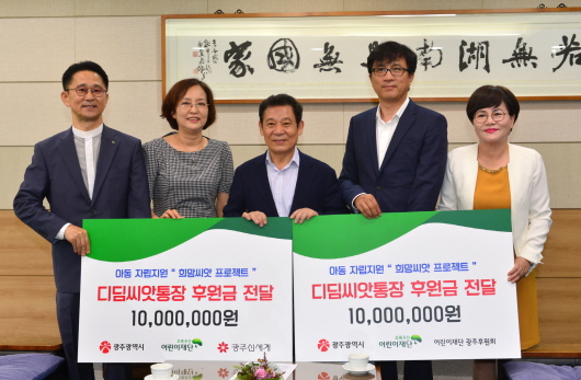 À̳¯ ±¤ÁÖ½Ãû 3Ãþ Á¢°ß½Ç¿¡¼ ¿¸° Àü´Þ½Ä¿¡´Â À±ÀåÇö ½ÃÀå°ú ±èÀº¿µ ÃÊ·Ï¿ì»ê¾î¸°ÀÌÀç´Ü ±¤ÁÖÁö¿ªº»ºÎÀå, ÀÓÈÆ ±¤Áֽż¼°è ´ëÇ¥ÀÌ»ç µîÀÌ Âü¼®Çß´Ù. ±¤Áֽż¼°è¿Í ÃÊ·Ï¿ì»ê¾î¸°ÀÌÀç´ÜÀÌ °¢°¢ 1000¸¸¿ø¾¿ ±âŹÇÑ ÈÄ¿ø±ÝÀº ¸Å¿ù ÀÏÁ¤¾×À» ÀúÃàÇϱ⠹÷Âù ±âÃʼö±Þ°¡±¸ ¾Æµ¿ 700¿© ¸íÀÇ µðµõ¾¾¾ÑÅëÀå¿¡ ÀÏÁ¤ ±Ý¾×À» ´ë½Å Àû¸³ÇØ Áִµ¥ ¾²ÀÏ ¿¹Á¤ÀÌ´Ù.