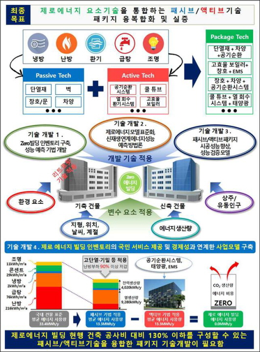»ç¾÷ºñ´Â ±¹ºñ 60¾ï¿ø, ½Ãºñ 6¾ï¿ø(¿¹Á¤), ¹ÎÀÚ 21¾ï¿ø µî ÃÑ 87¾ï¿øÀ̸ç, Á¦·Î¿¡³ÊÁöºôµùÀÇ ¿¡³ÊÁö »ç¿ë·®À» ±âÁØÀ¸·Î ½ÅÀç»ý¿¡³ÊÁö¿Í ¿¬°èÇØ ÅëÇÕ¼³°è¸ðµ¨À» Ç¥ÁØÈÇÏ´Â ±â¼ú°³¹ß°úÁ¦·Î¼ ¡ãÆÐ½Ãºê(´Ü¿, ±â¹Ð¼º, Á¶¸í µî) ¡ã¾×Ƽºê(½ÅÀç»ý¿¡³ÊÁö, °íÈ¿À²º¸ÀÏ·¯ µî) 4°³ °úÁ¦¿Í ½ÇÁõ»ç¾÷ 1°³·Î ±¸¼ºµÆ´Ù. Á¦·Î¿¡³ÊÁöºôµùÀº °Ç¹°ÀÌ ¼ÒºñÇÏ´Â ¿¡³ÊÁö¿Í °Ç¹° ³» ½ÅÀç»ý¿¡³ÊÁö ¹ßÀü·®À» ÇÕ»êÇØ ¿¡³ÊÁö ¼Òºñ·®ÀÌ ÃÖÁ¾ÀûÀ¸·Î ¿µ(Net Zero)ÀÌ µÇ´Â °ÇÃ๰À» ¸»ÇÑ´Ù.