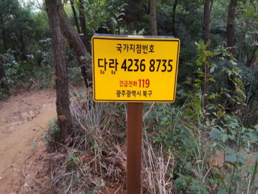 3ÀÏ ºÏ±¸¿¡ µû¸£¸é ¿î¾Ï»ê, ¸Å°î»ê, »ï°¢»ê, ³ë°íÁö¸®»ê µî °ü³» µî»ê·Î 4°÷¿¡ ±ä±Þ±¸Á¶ ¿äû ½Ã Á¤È®ÇÑ À§Ä¡¸¦ ³ªÅ¸³¾ ¼ö ÀÖ´Â ±¹°¡ÁöÁ¡¹øÈ£ÆÇ 21°³¸¦ ¼³Ä¡Çß´Ù. ±¹°¡ÁöÁ¡¹øÈ£ÆÇÀº µµ·Î¸í ÁÖ¼Ò°¡ ºÎ¿©µÇÁö ¾Ê´Â »ê¡¤µéÆÇ µî¿¡ ¼³Ä¡ÇØ ±â°ü¸¶´Ù ¼·Î ´Ù¸¥ À§Ä¡Ç¥½Ãü°è¸¦ ÅëÀÏ, Á¶³ÀÚÀÇ Á¤È®ÇÑ À§Ä¡¸¦ ÆÄ¾ÇÇÏ´Â ½Ã½ºÅÛÀ¸·Î ÇÑ±Û 2ÀÚ¸®¿Í ¼ýÀÚ 8ÀÚ¸®·Î ±¸¼ºµÆ´Ù.