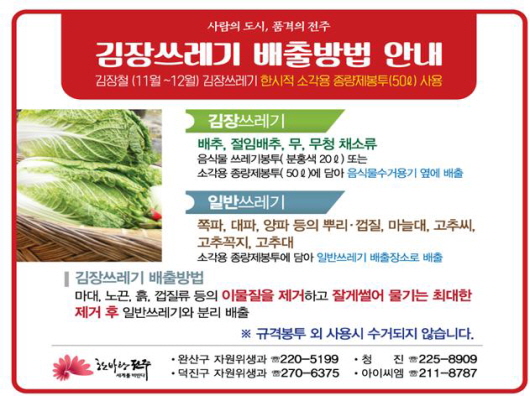 ±èÀå¾²·¹±âÀÇ ¹èÃâ¹æ¹ýÀº À½½Ä¹°¾²·¹±â ó¸®Àå ±â°è°íÀåÀÇ ¿øÀÎÀÌ µÇ´Â ¸¶´ëÀÚ·ç¿Í ³ë²ö, ¾çÆÄ¸Á µî À̹°ÁúÀº ¹Ýµå½Ã Á¦°ÅÇÑ ÈÄ ¹èÃâÇϰí, ¹èÃß¾²·¹±â´Â Àß°Ô ½ä¾î ¹°±â¸¦ ÃÖ´ëÇÑ Á¦°Å ÈÄ ¹èÃâÇϰí, ¸¶´Ã´ë¿Í °íÃß²ÀÁö´Â ÀϹݾ²·¹±â ºÀÅõ¿¡ ´ã¾Æ ¹èÃâÇϸéµÇ¸ç, ÀüÁֽô ±èÀå¾²·¹±â ¹èÃâ¹æ¹ý¿¡ ´ëÇÑ ÁֹεéÀÇ ÇùÁ¶»çÇ×À» È«º¸ ½ºÆ¼Ä¿¿Í Àü´ÜÁö·Î Á¦ÀÛÇÏ¿© ¹èÆ÷ÇÏ´Â µî ±èÀå¾²·¹±â 󸮿¡ ¸¸ÀüÀ» ±âÇÒ ¹æÄ§ÀÌ´Ù.