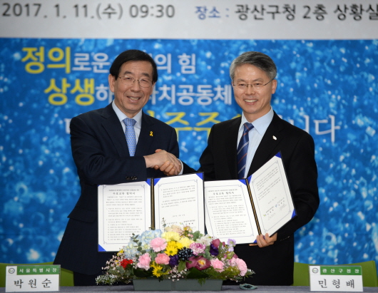 ±¤»ê±¸¿Í ¼¿ï½Ã´Â À̳¯ ¿ÀÀü 9½Ã 30ºÐ ±¤»ê±¸Ã» »óȲ½Ç¿¡¼ ¹Ú¿ø¼ø ¼¿ï½ÃÀå°ú ¹ÎÇü¹è ±¤»ê±¸Ã»ÀåÀÌ Âü¼®ÇØ ¡®¿ì¼ö Á¤Ã¥»ç·Ê Çù¾à¡¯À» ü°áÇß´Ù. Çù¾àÀº ¼¿ï½ÃÀÇ Á¦¾ÈÀ¸·Î ÀÌ·ïÁ³´Ù. ±¤»ê±¸¿Í ¼¿ï½Ã´Â 6°³ ºÐ¾ß Á¤Ã¥ °øÁ¶ Çù¾àÀ» ¸Î¾ú´Ù. ¡â½ÃÁ¤Çõ½Å ¹× ¿ì¼ö Á¤Ã¥»ç·Ê Á¤º¸ °øÀ¯ ¡â»çȸÀû°æÁ¦ Çù·Â ¡â¸¶À»°øµ¿Ã¼ ³×Æ®¿öÅ© ±¸Ãà¡â¹®È¿¹¼ú ±³·ù È®´ë ¡âû³â ÀÚ¸³ »ýŰè Á¶¼º Çù·Â ¡â»ç¶÷ Áß½ÉÀÇ µµ½ÃÀç»ý ¹× µµ½ÃµðÀÚÀÎ Á¤Ã¥ °øÀ¯°¡ Çù¾àÀÇ ´ë»óÀÌ´Ù.