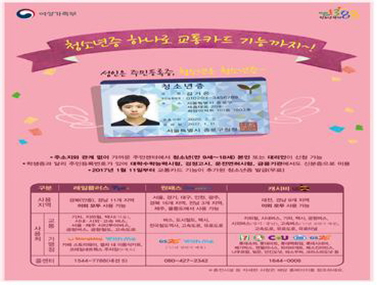 ÀÌ´Â ¿©¼º°¡Á·ºÎ°¡ û¼Ò³âµé ¿ä±¸¸¦ ¹Ý¿µÇØ ½Ç»ýȰ¿¡¼ Æí¸®Çϰí À¯¿ëÇÏ°Ô »ç¿ëµÉ ¼ö ÀÖµµ·Ï ±³ÅëÄ«µå ¹× ¼±ºÒ°áÁ¦ ±â´ÉÀÌ Ãß°¡µÈ ¹«·á ¹ß±Þ Ä«µå·Î °¡±î¿î Áֹμ¾ÅÍ¿¡¼ û¼Ò³â º»ÀÎ ¶Ç´Â ´ë¸®ÀÎ ½Åû °¡´ÉÇÏ¸ç ´ëÇмöÇдɷ½ÃÇè, °ËÁ¤°í½Ã, ¿îÀü¸éÇã½ÃÇè, ±ÝÀ¶±â°ü¿¡¼ ½ÅºÐÁõÀ¸·Î »ç¿ëÇÒ ¼ö ÀÖ´Ù.