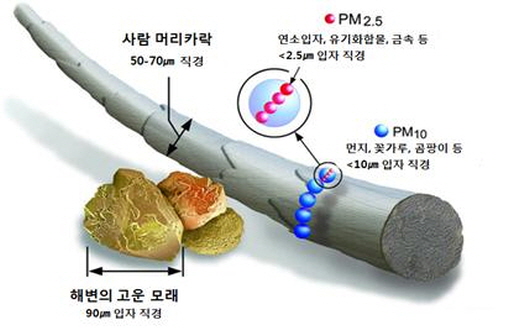 ¹Ì¼¼¸ÕÁö´Â ´ë±â Áß¿¡ ¶°´Ù´Ï´Â 10§ ÀÌÇÏÀÇ ÀÔÀÚ»ó ¹°ÁúÀ» ¸»ÇÑ´Ù. »ç¶÷ÀÇ ¸Ó¸®Ä«¶ô Á÷°æÀÌ 60§ Á¤µµÀÓÀ» °¨¾ÈÇϸé À̺¸´Ù 6¹è ³Ñ°Ô ¹Ì¼¼ÇÑ ¹°ÁúÀÓÀ» ¾Ë ¼ö ÀÖ´Ù. ¹Ì¼¼¸ÕÁö´Â ¶Ç Å©±â¿¡ µû¶ó PM10(10§ ÀÌÇÏ)°ú PM2.5(2.5§ ÀÌÇÏ)·Î ±¸ºÐµÈ´Ù. ¹Ì¼¼¸ÕÁö ³óµµ°¡ ÀÏÁ¤¼öÁØ(PM10 81§¶/§© ¶Ç´Â PM2.5 51§¶/§© ÀÌ»ó)À» ³Ñ¾î¼¸é ¿¹º¸µî±ÞÀÌ ¡®³ª»Ý¡¯ÀÌ µÇ°í, ÀÌ ¼öÁØÀ» ³Ñ¾î¼± ³óµµ°¡ ÀÏÁ¤½Ã°£ Áö¼ÓµÉ °æ¿ì ¡®ÁÖÀǺ¸¡¯¿Í ¡®°æº¸¡¯°¡ ¹ß·ÉµÈ´Ù.