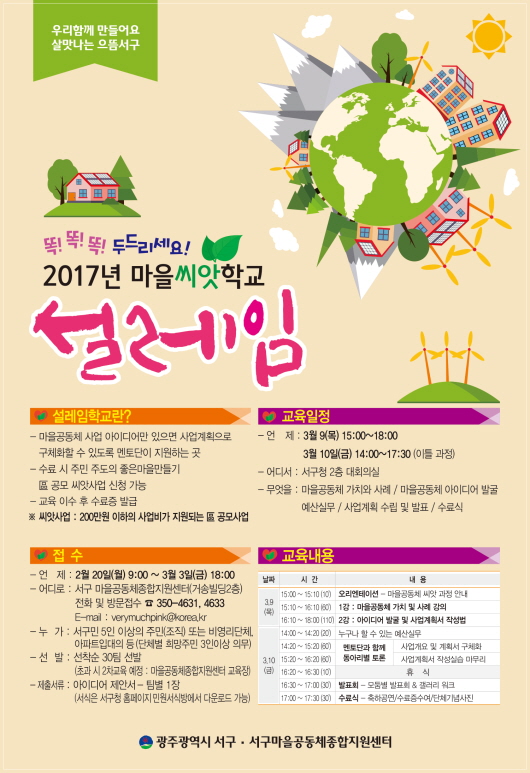 ¡®¼³·¹ÀÓ¡¯Àº °ø¸ð»ç¾÷À» Áö¿øÇϱâ Àü µÎ±Ù°Å¸®´Â ¸¶À½À» Ç¥ÇöÇÑ °ÍÀ¸·Î ¸¶À»°øµ¿Ã¼ÀÇ ±âº»±³À°ºÎÅÍ ¸¶À»°èȹ¼ö¸³±îÁö ü°èÀûÀ¸·Î Áö¿øÇÏ´Â »ç¾÷ÀÌ´Ù. À̹ø ¸¶À»Çб³´Â ÁÖ¹ÎÁÖµµ ¸¶À»°øµ¿Ã¼ÀÇ ÀÚÀ²¼º°ú Áö¼Ó°¡´É¼ºÀ» ³ôÀ̱â À§ÇØ ¡®¸¶À»°øµ¿Ã¼ °¡Ä¡ ¹× »ç·Ê¡¯, ¡®¾ÆÀ̵ð¾î ¹ß±¼¹æ¹ý¡¯, ¡®»ç¾÷°èȹ¼ ÀÛ¼º¡¯ µî ´Ù¾çÇÑ ÇÁ·Î±×·¥ÀÌ ÁغñµÇ¾ú´Ù.