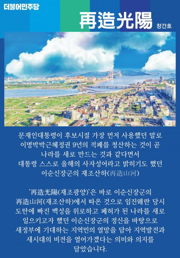 Áö¿ªÀ§¿¡ µû¸£¸é È«º¸Áý ¡®î¢ðãÎÃåÕ(ÀçÁ¶±¤¾ç)¡¯Àº À̼ø½ÅÀ屺ÀÇ î¢ðãߣùÁ(ÀçÁ¶»êÇÏ)¿¡¼ µû¿Â °ÍÀ¸·Î ÀÓÁø¿Ö¶õ ´ç½Ã µµÅº¿¡ ºüÁø ¹é¼ºÀ» À§·ÎÇÏ°í ÆóÇã°¡ µÈ ³ª¶ó¸¦ »õ·Î ÀÏÀ¸Å°°íÀÚ Çß´ø À̼ø½ÅÀ屺ÀÇ Á¤½ÅÀ» ¹ÙÅÁÀ¸·Î »õ Á¤ºÎ¿¡ ±â´ëÇÏ´Â Áö¿ª¹ÎÀÇ ¿¸ÁÀ» ´ã¾Æ Áö¿ª¹ßÀü°ú ºñÀüÀ» ¿¾î°¡°Ú´Ù´Â ÀÇ¹Ì¿Í ÀÇÁö¸¦ ´ã¾Ò´Ù.