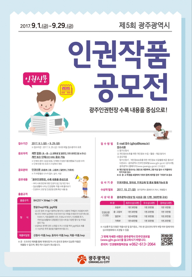 ƯÈ÷, ¿ÃÇØ´Â UCC³ª Ç¥¾î, Æ÷½ºÅÍ µîÀ¸·Î Á¢¼öÇÑ ±âÁ¸ °ø¸ðÀü°ú Â÷º°ÈÇØ Ÿ ÁöÀÚü¿¡¼µµ ½ÃµµÇÏÁö ¾ÊÀº ¡®½Å¹®¡¯ Çü½ÄÀ¸·Î ÀÛǰÀ» ¸ðÁýÇϰí, °¡Á·ÀÌ ´ëÈÇϸç Àαǿ¡ ´ëÇÑ ÀνÄÀ» °³¼±ÇÏ´Â ±âȸ¸¦ Á¦°øÇϱâ À§ÇØ °¡Á·ºÎ¹®À» Ãß°¡Çß´Ù. ÀÀ¸ðÀÛ¿¡ ´ëÇØ¼´Â °¢ ºÐ¾ß Àü¹®°¡¿Í ÀαÇȰµ¿°¡ µîÀ¸·Î ±¸¼ºµÈ ½É»çÀ§¿øÈ¸°¡ ÀαÇÁöÇ⼺, âÀǼº, ÀαDZ³À° ¹× È«º¸ Ȱ¿ë°¡´É¼º µîÀ» ±âÁØÀ¸·Î ½É»çÇØ 4°³ ºÎ¹®, °¢°¢ ÃÖ¿ì¼ö, ¿ì¼ö, Àå·Á»ó µî 12ÆíÀ» ¼±Á¤ÇÑ´Ù. ¼ö»óÀÚ¿¡°Ô´Â ½ÃÀå ǥâ°ú ÃÑ 300¸¸¿ø ±Ô¸ðÀÇ ½Ã»ó±ÝÀ» ¼ö¿©ÇÒ ¿¹Á¤´Ù. ¼ö»óÀÛÀº 10¿ù27ÀÏ ±¤Áֽà ȨÆäÀÌÁö¿¡¼ ¹ßÇ¥Çϰí ÀÛǰÁýÀ¸·Î Á¦ÀÛÇØ Àαǰ¨¼ö¼º ÇÔ¾çÀ» À§ÇÑ È«º¸, ±³À°ÀÚ·á·Î Ȱ¿ëÇϸç 12¿ùÁß ¼¼°èÀαǼ±¾ð ±â³äÁÖ°£¿¡ Àü½ÃÇÒ °èȹÀÌ´Ù.