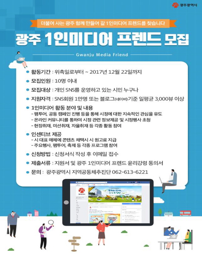 ±¤ÁÖ±¤¿ª½Ã´Â ¼Ò¼È¹Ìµð¾î ¿î¿µÀÚÀÇ Âü¿©¿Í ´Ù¾çÇÑ ÄÜÅÙÃ÷ È®º¸¸¦ À§ÇØ ¡®±¤ÁÖ1Àι̵ð¾î ÇÁ·»µå¡¯¸¦ ¿À´Â 7ÀϺÎÅÍ 18ÀϱîÁö ¸ðÁýÇÑ´Ù. 1ÀÎ ¹Ìµð¾î´Â °³ÀÎ ºí·Î±×³ª SNS µîÀ» ±â¹ÝÀ¸·Î ÇØ °³ÀÎÀÌ ´Ù¾çÇÑ ÄÜÅÙÃ÷¸¦ »ý»êÇÏ°í °øÀ¯ÇÏ´Â ÀÇ»ç¼ÒÅë ±¸Á¶´Ù.