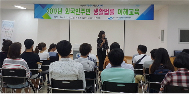 ÀÌ ±³À°Àº ¿î¿µ±â°£ ¸ÅÁÖ ÀÏ¿äÀÏ ¿ÀÈÄ 1½ÃºÎÅÍ 3½Ã±îÁö ¿Ü±¹ÀÎÁÖ¹ÎÁ¾ÇÕÁö¿ø¼¾ÅÍ¿¡¼ ÁøÇàµÈ´Ù. ¿©¼ö½Ã´Â ¿Ü±¹ÀÎ ÁֹεéÀÌ ³ë·¡°¡»ç¸¦ ÀÍÈ÷°í µû¶ó ºÎ¸£¸é¼ Àç¹ÌÀÖ°Ô ¾îÈÖ¿Í ¹®¹ý, Ç¥ÇöÀ» ¹è¿ï ¼ö ÀÖµµ·Ï ±³À°À» ¸¶·ÃÇß´Ù. ¿©¼ö½Ã °ü°èÀÚ´Â ¡°¿Ü±¹ÀÎ ÁֹεéÀÇ ¾ÈÁ¤ÀûÀÎ »ýȰÀ» À§ÇØ ¿Ü±¹ÀÎÁÖ¹ÎÁ¾ÇÕÁö¿ø¼¾Å͸¦ ÅëÇØ ´Ù¾çÇÑ ÇÁ·Î±×·¥À» ¿î¿µÇϰí ÀÖ´Ù¡±¸ç ¡°À̵éÀÇ °¡Àå Å« °ü½É»çÀÎ Ãë¾÷Ȱµ¿¿¡ ´ëÇÑ ±³À°µµ °í¿ë³ëµ¿ºÎ ¿©¼öÁöû°ú ¿¬°èÇØ Áö¼ÓÀûÀ¸·Î ½Ç½ÃÇÒ °èȹ¡±À̶ó°í ¹àÇû´Ù.