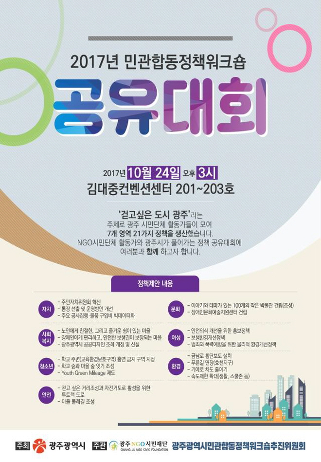 ÇÑÆí, ±¤ÁֽùΰüÇÕµ¿Á¤Ã¥¿öÅ©¼óÀº ½Ã¹Î»çȸ´Üü¿Í ½ÃÁ¤ Çö¾È¿¡ ´ëÇÑ Á¤Ã¥´ë¾È ¹ß±¼ ¹× ¼ÒÅëÀÇ °Å¹ö³Í½º¸¦ ±¸ÃàÇϱâ À§ÇØ 2001³âµµºÎÅÍ ½ÃÀÛÇØ ¿ÃÇØ·Î 16³â°¸¦ ¸Â¾Ò´Ù. ±×µ¿¾È ÇàÁ¤ÀÚÄ¡ºÎ·ÎºÎÅÍ Á¤ºÎ3.0 ¼±µµ°úÁ¦·Î ÁöÁ¤µÇ´Â µî Ÿ ÁöÀÚü¿¡¼´Â º¸±â µå¹® ¹Î°üÇùÄ¡ÀÇ ¿ì¼ö»ç·Ê·Î ÀÎÁ¤¹Þ¾Æ ¿Ô´Ù.