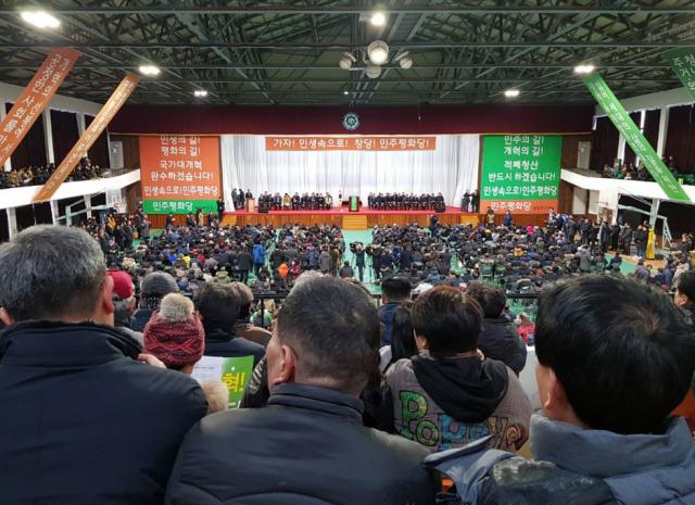 À̳¯ °áÀÇ´ëȸÀå¿¡´Â ¡®¹Î»ýÀÇ ±æ, ÆòÈÀÇ ±æ, ±¹°¡´ë°³Çõ ¿Ï¼ö¡¯ ¿Í ¡®¹ÎÁÖÀÇ ±æ, °³ÇõÀÇ ±æ, ÀûÆóû»êÀ» ÇØ³»ÀÚ¡¯´Â Çö¼ö¸·ÀÌ ¹«´ë ¾çÂÊ¿¡ °É·È°í Çà»çÀå ¾Õ¿¡¼´Â ³ì»ö°ú ÁÖȲ»ö Áß¿¡ ¹ÎÁÖÆòÈ´çÀÇ »ó¡»öÀ» °áÁ¤Çϱâ À§ÇØ Âü°¡ÀÚµéÀÌ ¼±È£ÇÏ´Â »öÀ» ½ºÆ¼Ä¿·Î Ç¥½ÃÇÏ´Â À̺¥Æ®¸¦ ÁøÇàÇϱ⵵ Çß´Ù.