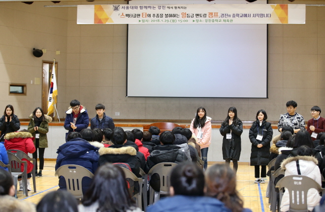 °Áø±º¹ÎÀåÇÐÀç´ÜÀÌ Áö¿øÇÏ´Â ¼¿ï´ë¡¤°ÁøÁö¿ª ÁßÇлý°úÀÇ ¸àÅ䡤¸àÆ® °Ü¿ïÄ·ÇÁ°¡ 29ÀÏ °³°½ÄÀ» ½ÃÀÛÀ¸·Î 5Àϰ£ °ÁøÁßÇб³¿¡¼ °³ÃֵȴÙ. °Áø¿ø °Áø±º¼ö´Â 29ÀÏ °³°½Ä¿¡ Âü¼®ÇØ ¡°¹æÇп¡µµ ÇÁ·Î±×·¥¿¡ Âü¿©ÇÏ´Â ÇлýµéÀÌ ´ë°ßÇÏ°í ¸Õ °÷±îÁö Àç´ÉÀ» ±âºÎÇÏ·¯ ¿Â ´ëÇлýµéÀÌ °í¸¿´Ù¡±¸ç ¡°ÇлýµéÀÌ ¸àƼ·Î¼ ´ëÇлý ¸àÅäµéÀÇ Àç´É°ú °æÇèÀ» Àß ¹è¿ö¼ ²ÞÀ» ã°í ÀڽۨÀ» ´À³¢´Â °è±â°¡ µÇ±æ ¹Ù¶õ´Ù¡±°í ¸»Çß´Ù.