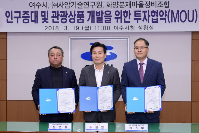 ¿©¼ö½Ã´Â 19ÀÏ ¿ÀÀü ½Ãû »óȲ½Ç¿¡¼ ¢ß»ç¾Ï±â¼ú¿¬±¸¿ø, ȾçºÐÀ縶À»Á¤ºñÁ¶ÇÕ°ú ÀÌ °°Àº ³»¿ëÀÇ ÅõÀÚÇù¾àÀ» ü°áÇß´Ù°í ¹àÇû´Ù. À̳¯ ÁÖöÇö ¿©¼ö½ÃÀå°ú À±Ãáö ¢ß»ç¾Ï±â¼ú¿¬±¸¿ø ´ëÇ¥, ±è¿ë¹¬ ȾçºÐÀ縶À»Á¤ºñÁ¶ÇÕÀå µîÀº °¢°¢ 150¾ï ¿ø, 225¾ï ¿ø µî ÃÑ 375¾ï ¿øÀÇ ÅõÀÚ¸¦ ¾à¼ÓÇß´Ù.