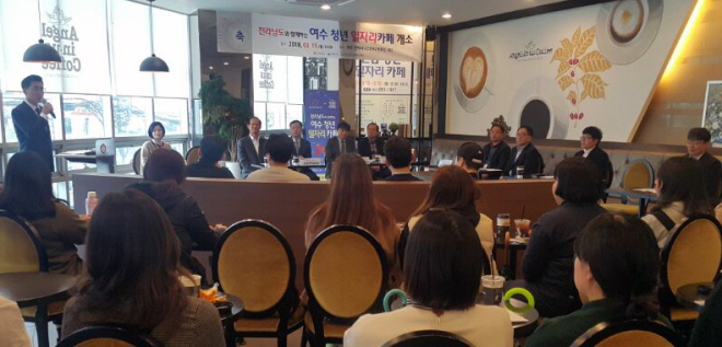 20ÀÏ ¿©¼ö½Ã¿¡ µû¸£¸é 19ÀÏ ¿£Á¦¸®³Ê½º ½ÖºÀÁ¡¿¡¼ ¿©¼ö½Ã û³â ÀÏÀÚ¸®Ä«Æä °³¼Ò½ÄÀÌ ¿·È´Ù. À̳¯ °³¼Ò½Ä¿¡´Â ÃÖÁ¾¼± ¿©¼ö½Ã ºÎ½ÃÀå, Á¤¿µÁØ Àü³²Ã¢Á¶°æÁ¦Çõ½Å¼¾ÅÍÀå, Áö¿ª ´ëÇÐ °ü°èÀÚ µîÀÌ Âü¼®Çß´Ù.