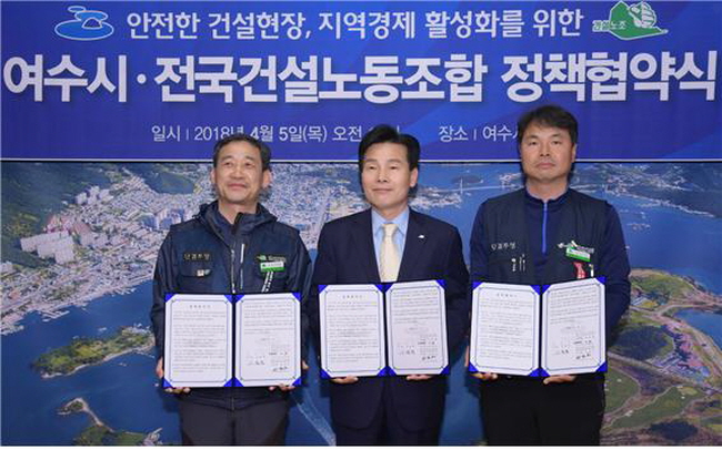 ¿©¼ö½Ã¿Í ³ëµ¿Á¶ÇÕ¿¡ µû¸£¸é 5ÀÏ ¿ÀÀü 10½Ã ÁÖöÇö ¿©¼ö½ÃÀåÀº Áý¹«½Ç¿¡¼ ±¤ÁÖÀü³²°Ç¼³ÁöºÎ ³²»ó¹è ÁöºÎÀå, ±¤ÁÖÀü³²°Ç¼³±â°èÁöºÎ Á¤¾ç¿Á ÁöºÎÀå°ú ±Ù·ÎÀÚ ±Ç¸®º¸È£¿Í ¾ÈÀüÇÑ °Ç¼³ÇöÀå, °í¿ë¾ÈÁ¤, Áö¿ª°æÁ¦ Ȱ¼ºÈ¸¦ À§ÇÑ Á¤Ã¥Çù¾àÀ» ü°áÇß´Ù.