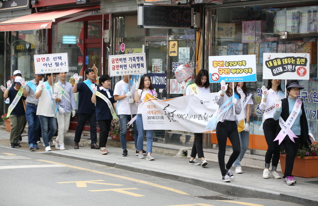 °¡µÎÄ·ÆäÀÎÀº ¼¼°è ±Ý¿¬ÀÇ ³¯À» ¸ÂÀÌÇÏ¿© ´ã¹è¿¡ ´ëÇÑ ÀÇÁ¸À¸·ÎºÎÅÍ Å»ÇÇÇÒ ¼ö ÀÖ´Â °è±â¸¦ ¸¶·ÃÇϰí Èí¿¬ÀÌ °Ç°¿¡ ¹ÌÄ¡´Â ÆóÇØ¸¦ Àڶ󳪴 û¼Ò³âµé¿¡°Ô °æ°¢½ÉÀ» ÁÖ°íÀÚ °Áøµ¿ÃʵîÇлý, ±³»ç, º¸°Ç¼Ò Á÷¿ø µî 100¿©¸íÀÌ Âü¼®ÇØ È«º¸È°µ¿À» ÆîÃÆ´Ù.