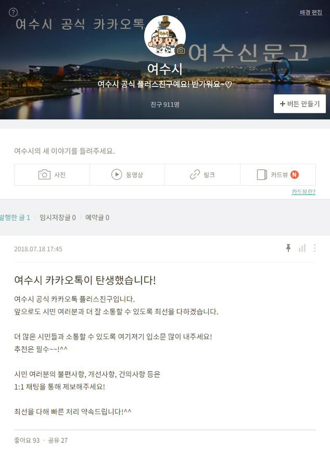 ¿©¼ö½Å¹®°í ÀÌ¿ëÀ» ¿øÇÏ´Â ½Ã¹ÎÀº īī¿ÀÅå ¾Û¿¡¼ ¡®¿©¼ö½Ã¡¯¸¦ °Ë»öÇØ Ç÷¯½ºÄ£±¸ ¿©¼ö½Ã¸¦ Ŭ¸¯ÇÑ ÈÄ 1:1 ´ëÈ ¿äûÀ» ÇÏ¸é µÈ´Ù.