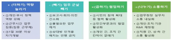 ±¤Áֽô ¾÷¹« ±º»ìÀ» »© ½Ã¹ÎÆíÀÍ ÁõÁøÀ» À§ÇÑ ¿ª·®Àº ´Ã¸®°í, ½Ã¹Î°úÀÇ ¼ÒÅë°ú ÇùÄ¡¸¦ °ÈÇØ ½ÃÁ¤¿î¿µÀÇ ½Ã³ÊÁö¸¦ ±Ø´ëÈÇØ ³ª°¥ °èȹÀÌ´Ù. À̸¦ À§ÇØ Á¤Ã¥À̳ª º¸Á¶»ç¾÷ µî¿¡ ´ëÇÑ ÀϸôÁ¦(3³â)¸¦ °ÈÇϰí ÇàÁ¤¾÷¹«¸¦ °£¼ÒÈÇÑ Ç¥ÁؾÈÀ» ¸¶·ÃÇÏ´Â µî ¾÷¹«Çõ½Å 4Ä¢ ¿¬»êÀ» ÅëÇØ ÀÌÇØ¿Í ¹è·ÁÀÇ ÇàÁ¤ ¹®È¸¦ Á¶¼ºÇØ ³ª°¡°Ô µÈ´Ù.