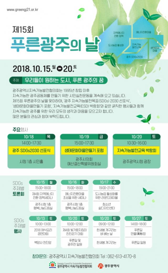 ¿ÃÇØ ¸ÞÀÎÇà»ç·Î´Â 18ÀÏ ¿ÀÈÄ 2½Ã ½Ãû 1Ãþ ½Ã¹ÎȦ¿¡¼ ¡®±¤ÁÖ SDGs 2030 ¸ñÇ¥¡¤ÁöÇ¥ ¼±Æ÷½Ä¡¯À» ºñ·ÔÇØ ¡ã»ýŹ®È¸¶À»¸¸µé±â 10Áֳ⠱â³ä Æ÷·³¡¤ÅäÅ©ÄܼƮ(19ÀÏ ¿ÀÈÄ 3½Ã ½ÃÀÇȸ 5Ãþ ȸÀǽÇ) ¡ãÁö¼Ó°¡´É¹ßÀü±³À°(ESD) ¹Ú¶÷ȸ(20ÀÏ ¿ÀÀü 10½Ã30ºÐ ½Ãû ¾ß¿ÜÀ½¾Ç´ç) µîÀÌ ¸¶·ÃµÆ´Ù.