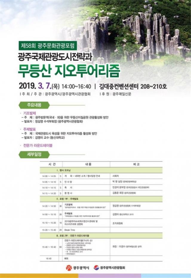 ±¤ÁÖ±¤¿ª½Ã ÁÖÃÖ, (»ç)±¤ÁÖ±¤¿ª½Ã°ü±¤Çùȸ ÁÖ°üÀ¸·Î ¸¶·ÃµÈ À̹ø Æ÷·³¿¡¼´Â 2019±¤ÁÖ¼¼°è¼ö¿µ¼±¼ö±Ç´ëȸ¸¦ ¾ÕµÎ°í °ü±¤È°¼ºÈ ¹æ¾ÈÀ» ¸ð»öÇÑ´Ù. ƯÈ÷ °ü±¤ºÐ¾ß Àü¹®°¡, À¯°ü±â°ü, Çаè, ¿©Çà»ç °ü°èÀÚ µîÀÌ Âü¿©ÇØ ¡®±¤ÁÖ±¹Á¦°ü±¤µµ½Ã Àü·«°ú ¹«µî»ê Áö¿ÀÅõ¾î¸®Áò¡¯À» ÁÖÁ¦·Î ÀǰßÀ» ³ª´«´Ù.
