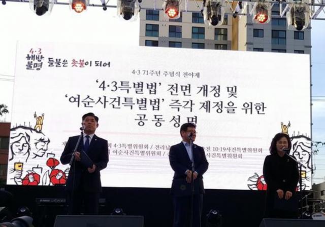 4¿ù 2ÀÏ Àú³á Á¦ÁÖ½Ãû ±¤Àå¿¡¼ ¿¸° Á¦71ÁÖ³â Á¦ÁÖ 4.3Èñ»ýÀÚ Ãß³ä½Ä Àü¾ßÁ¦¿¡¼ Á¦ÁÖÆ¯º°ÀÚÄ¡µµÀÇȸ 4.3Ưº°À§¿øÈ¸, Àü¶ó³²µµÀÇȸ ¿©¼ö¡¤¼øÃµ 10¡¤19»ç°ÇƯº°À§¿øÈ¸, ¿©¼ö½ÃÀÇȸ ¿©¼ø»ç°ÇƯº°À§¿øÈ¸, ¼øÃµ½ÃÀÇȸ ¿©¼ø»ç°ÇƯº°À§¿øÈ¸´Â¡®±¹°¡°ø±Ç·Â¿¡ Èñ»ýµÈ Á¦ÁÖ 4.3 ¹× ¿©¼ø»ç°Ç Èñ»ýÀÚÀÇ ¸í¿¹¸¦ ȸº¹Ç϶ó!¡¯¸ç Ưº°¹ý Á¦Á¤À» Ã˱¸ÇÏ´Â °øµ¿¼º¸íÀ» ¹ßÇ¥Çß´Ù.