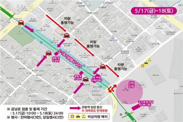 ¶ÇÇÑ, ±¤Áֽô ±Ý³²·Î ÀÏ¿ø¿¡¼ ¿¸®´Â 5¡¤18¹ÎÁÖȿ Àü¾ßÁ¦ µî ¿øÈ°ÇÑ Çà»çÁøÇàÀ» À§ÇØ 17ÀÏ ¿ÀÀü 10½ÃºÎÅÍ 18ÀÏ ¹ã 12½Ã±îÁö ±Ý³²·Î ¾Æ½Ã¾Æ¹®ÈÀü´ç ¾Õ 5¡¤18¹ÎÁÖ±¤Àå~±Ý³²°ø¿ø ±¸°£ÀÇ Â÷·® ÅëÇàÀ» ÀϽà ÅëÁ¦ÇÑ´Ù. ÀÌ¿¡ µû¶ó 5¡¤18¹ÎÁÖ±¤Àå ¾ÕÀ» °æÀ¯ÇÏ´Â ½Ã³»¹ö½º 22°³ ³ë¼±Àº ±Ý³² 4°Å¸®¿¡¼ ¿ìȸ ¿îÇàµÈ´Ù.