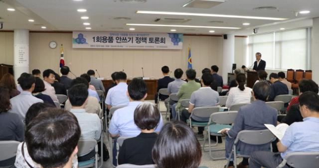 ÇÑÆí, À̹ø Åä·Ðȸ¿¡´Â Àü³²µµÀÇ¿ø°ú Àü³²È¯°æ¿îµ¿¿¬ÇÕ, ÀÚ¿ø¼øÈ¯¿¬´ë °ü°èÀÚ ¹× µµ․½Ã±º °ø¹«¿ø µî 120¿©¸íÀÌ Âü¼®ÇØ 1ȸ¿ëǰ »ç¿ë ±ÔÁ¦¿¡ ´ëÇÑ ¸¹Àº °ü½ÉÀ» ³ªÅ¸³Â´Ù. ¶ÇÇÑ À̳¯ Âü¼®ÀÚµéÀº ¡®1ȸ¿ëǰ ¾È¾²±â¡¯¿¡ µ¿ÂüÇÏ´Â Àǹ̸¦ ´ã¾Æ 1ȸ¿ë Á¾ÀÌÄÅ ´ë½Å ¸Ó±×ÄÅÀ» °¡Áö°í Âü¼®ÇØ ´«±æÀ» ²ø¾ú´Ù.