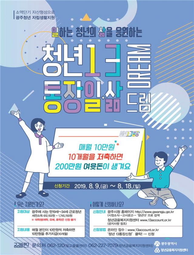 ±¤Áֽô À̹ø Ã߰濹»ê¿¡ Æí¼ºµÈ 5¾ï¿øÀ¸·Î, ÅëÀåÁö¿ø»ç¾÷ÀÇ ¸ñÇ¥¸¦ °í¿ëÀ¸·ÎÀÇ ¾ÈÁ¤ÀûÀÎ ÀÌÇà°ú »çȸÁøÀÔ ÃËÁøÀ¸·Î Á¤Çϰí ÃÖ¼ÒÇÑÀÇ »ýȰ¾ÈÁ¤À» µÞ¹ÞħÇÑ´Ù´Â °èȹÀÌ´Ù. Âü¿© ´ë»óÀº ±¤ÁÖ¿¡ °ÅÁÖÇÏ´Â ¸¸ 19¼¼ºÎÅÍ 34¼¼±îÁöÀÇ ±Ù·Îû³âÀÌ´Ù. ¼¼±ÝÀ» Æ÷ÇÔÇØ ÃÖ±Ù 3°³¿ù°£ Æò±Õ±Þ¿© ±Ù·Î¼ÒµæÀÌ 61¸¸2102¿ø ÀÌ»ó 174¸¸5150¿ø ÀÌÇÏÀΠû³âÀÌ ½ÅûÇÒ ¼ö ÀÖ´Ù.