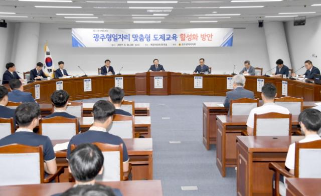 À̹ۿ¡µµ, Åä·Ð¿¡ Âü¿©ÇÑ ±³À°Ã» ÀåÇдã´ç, Àϼ±Çб³, »ó°øÈ¸ÀǼÒ, µµÁ¦±â¾÷ °ü°èÀÚµéÀº ¡°³ë・»ç¡¤¹Î¡¤Á¤ »ó»ýÀÇ »çȸÅëÇÕ ±¤ÁÖÇüÀÏÀÚ¸®¸¦ ±â¹ÝÀ¸·Î ÇÑ ¸ÂÃãÇü µµÁ¦±³À°Àº ±× µ¿¾ÈÀÇ µµÁ¦ ±³À°ÀÇ ³ëÇÏ¿ì¿Í ±âƲÀ» ¹ÙÅÁÀ¸·Î ±âÁ¸ »êÇÐÀÏüÇü µµÁ¦Çб³ÀÇ ¹®Á¦Á¡À» °³¼±ÇÏ°í º¸¿ÏÇÔÀ¸·Î½á, »õ·Î¿î ±¤ÁÖ Á÷¾÷±³À°ÀÇ ¸ðµ¨·Î ÀÚ¸®¸Å±èÇÏ°í ³ª¾Æ°¡ Àü±¹ ¿ì¼ö Á÷¾÷±³À° ¸ðµ¨·Î âÃâµÉ ¼ö ÀÖ´Â ¹Ø°Å¸§ÀÌ µÉ °ÍÀ¸·Î ±â´ëµÈ´Ù¡±´Â ¸ñ¼Ò¸®°¡ À̾îÁ³´Ù.