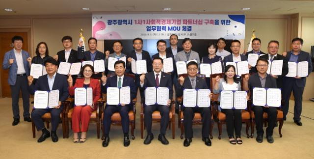±¤Áֽô 5ÀÏ ½Ãû ºñÁî´Ï½º·ë¿¡¼ ±¤ÁÖ½ÃÁö¼Ó°¡´É¹ßÀüÇùÀÇȸ, Áö¿ª±â¾÷ 15°÷, »çȸÀû°æÁ¦±â¾÷ ÇùÀÇȸ 4°÷, »çȸÀû°æÁ¦ Áß°£Áö¿ø±â°ü 2°÷°ú Áö¼Ó°¡´É°æ¿µ »ýŰè Á¶¼º°ú »çȸÀû°æÁ¦ Ȱ¼ºÈ¸¦ À§ÇÑ ¡®1»ç(Þä) 1»çȸÀû°æÁ¦±â¾÷ ÆÄÆ®³Ê½Ê ±¸ÃàÀ» À§ÇÑ ¾÷¹«Çù¾à¡¯À» ü°áÇß´Ù.