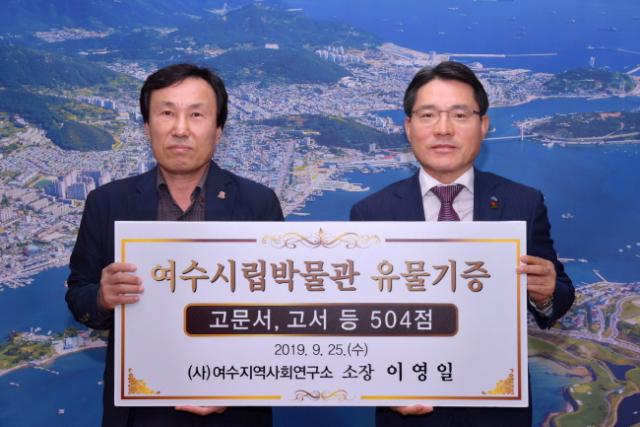 Áö³ 25ÀÏ¿¡´Â (»ç)¿©¼öÁö¿ª»çȸ¿¬±¸¼Ò(¼ÒÀå ÀÌ¿µÀÏ)°¡ °í¼, °í¹®¼, Åä±â µî À¯¹° 504Á¡À» ¿©¼ö½Ã¿¡ Àü´ÞÇϸç À¯¹°±âÁõ 1È£ ´Üü°¡ µÆ´Ù. ¿©¼ö½Ã´Â ±âÁõ¹ÞÀº À¯¹°À» º¸Á¸ ó¸®¿Í °¨Á¤ Æò°¡ÇÑ ÈÄ ¹Ú¹°°ü °³°ü Àü±îÁö ¼öÀå°í¿¡ º¸°üÇÒ °èȹÀÌ´Ù.