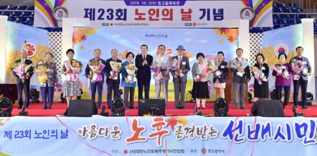 ±¤Áֽô 2ÀÏ ¼±¸ ºû°íÀ»Ã¼À°°ü¿¡¼ °ü³» ¾î¸£½Å 1000¿©¸í°ú °¢±Þ ±â°ü?´ÜüÀå µîÀÌ Âü¼®ÇÑ °¡¿îµ¥ Á¦23ȸ ³ëÀÎÀÇ ³¯ ±â³äÇà»ç¸¦ °³ÃÖÇß´Ù.¡®¾Æ¸§´Ù¿î ³ëÈÄ, Á¸°æ¹Þ´Â ¼±¹è½Ã¹Î¡¯À» ½½·Î°ÇÀ¸·Î ³»°Ç À̳¯ Çà»ç´Â ¾î¸£½ÅµéÀÌ Æò¼Ò °¥°í ´ÛÀº ¼Ø¾¾·Î ÁغñÇÑ ½ÄÀü°ø¿¬À» ½ÃÀÛÀ¸·Î, À̿뼷 ½ÃÀåÀÇ ¸ð¹ü¾î¸£½Å µî¿¡ ´ëÇÑ Ç¥Ã¢¼ö¿©¿Í ±â³ä»ç, ¿Àº´Ã¤ ´ëÇѳëÀÎȸ ±¤ÁÖ±¤¿ª½Ã¿¬ÇÕȸÀåÀÇ Àλ縻, ±èµ¿Âù ½ÃÀÇȸÀÇÀåÀÇ Ãà»ç ¼øÀ¸·Î ÁøÇàµÆ´Ù. ¶Ç ±â³ä½Ä ÈÄ¿¡´Â ÇѱÃ, ÅõÈ£´ëȸ¿Í ³ë·¡ÀÚ¶û, °Ç°Ã¼Á¶ µî ¾î¸£½ÅµéÀÌ Á÷Á¢ Âü¿©ÇÏ´Â ºÎ´ëÇà»ç°¡ ÇÔ²² ¿·È´Ù.