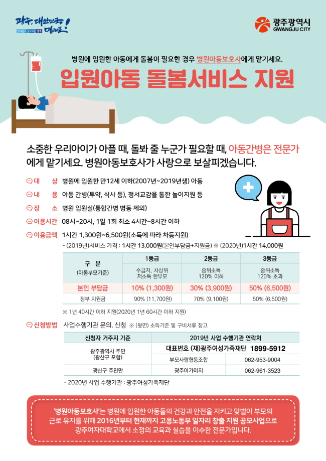 ÀÌ¿ë¹æ¹ýÀº »ç¾÷¼öÇà±â°üÀÎ ±¤ÁÖ¿©¼ºÀç´Ü(1899-5912)À¸·Î ½ÅûÇÏ¸é ¸ÅĪ½Ã½ºÅÛÀ» ÅëÇØ ¾Æµ¿º¸È£»ç¸¦ ¸ÅĪÇÑ ÈÄ ½Ã°£ µîÀ» Á¤ÇÏ¸é ¾ÆÀ̰¡ ÀÔ¿øÇÑ º´¿øÀ¸·Î ¾Æµ¿º¸È£»ç°¡ ¹æ¹®ÇØ ¾ÆÀ̸¦ µ¹º¸°Ô µÈ´Ù. ±¤Áֽô 6´ë ±¤¿ª½Ã Áß ¸Â¹úÀÌ ºñÁßÀÌ °¡Àå ³ôÀº ±¤ÁÖ°¡ À̹ø ¼ºñ½º·Î ¸Â¹úÀÌ °¡Á¤ÀÇ µ¹º½ »ç°¢Áö´ë°¡ ÇØ¼ÒµÇ°í ÀÔ¿ø¾Æµ¿¿¡ ´ëÇÑ Àü¹®ÀûÀÎ µ¹º½ÀÌ °¡´ÉÇØ ¾ÆÀ̵éÀÇ Á¤¼Àû ¾ÈÁ¤¿¡ ±â¿©ÇÒ °ÍÀ¸·Î ±â´ëÇϰí ÀÖ´Ù.