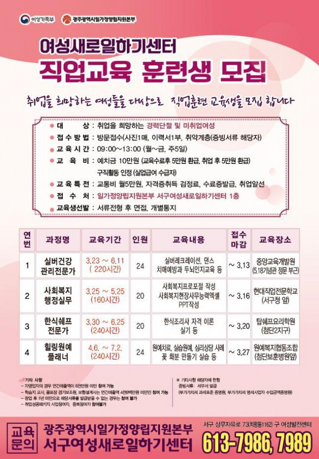 ±³À° ´ë»óÀº °æ·Â´ÜÀý ¿©¼º°ú ¹ÌÃë¾÷ ¿©¼ºÀ̸ç, ±³À° °úÁ¤Àº 20~24¸í ³»¿Ü ÁýÇÕ±³À°À¸·Î 2~3°³¿ù°£ ¿ÀÀü 9½ÃºÎÅÍ ¿ÀÈÄ 1½Ã±îÁö(ÁÖ5ȸ) ¿î¿µÇÑ´Ù. ±³À°ºñ´Â ¹«·áÀ̰í, ±³Åëºñ(¿ù5¸¸¿ø)¿Í ÀÚ°ÝÁõ Ãëµæ °ËÁ¤·á¸¦ Áö¿øÇÑ´Ù.