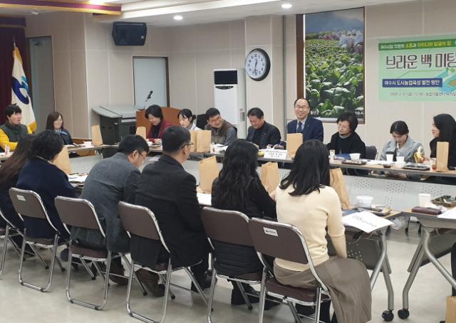 24ÀÏ ¿©¼ö½Ã¿¡ µû¸£¸é, Áö³ 21ÀÏ ³· 12½Ã ¿©¼ö½Ã ³ó¾÷±â¼ú¼¾ÅÍ È¸Àǽǿ¡¼ °ø¹«¿ø 30¸íÀÌ Âü¿©ÇÑ °¡¿îµ¥ ÀåÀÎÈ£ ³ó¾÷±â¼ú¼¾ÅͼÒÀå ÁÖÀç·Î ¡®µµ½Ã³ó¾÷À°¼º ¹ßÀü ¹æ¾È¡¯¿¡ ´ëÇÑ ºê¶ó¿î ¹é ¹ÌÆÃÀÌ ¿·È´Ù.
