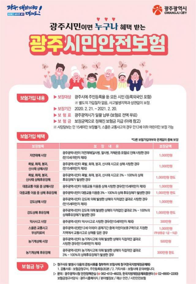 »ç°í ¹ß»ý Áö¿ªÀ̳ª ½Ã°£¿¡ °ü°è¾øÀÌ 1³â 365ÀÏ º¸ÀåµÇ°í, ´Ù¸¥ º¸Çè °¡ÀÔ ¿©ºÎ¿Í »ó°ü¾øÀÌ º¸Çè ¼öÇý°¡ °¡´ÉÇÏ´Ù. º¸Çè±Ý û±¸ ÀýÂ÷ µî ÀÚ¼¼ÇÑ »çÇ×Àº ½Ã ȨÆäÀÌÁöÀÇ ºÐ¾ßº°Á¤º¸/À糡¤¾ÈÀü/½Ã¹Î¾ÈÀüº¸Çè¼Ò°³¸¦ Âü°íÇϰųª, ½Ã ¾ÈÀüÁ¤Ã¥°ü½Ç(062-613-4923) ¶Ç´Â º¸Çè±â°üÀÎ Çѱ¹Áö¹æÀçÁ¤°øÁ¦È¸ Äݼ¾ÅÍ(02-6900-2200)·Î ¹®ÀÇÇÏ¸é µÈ´Ù. ¡Ø±¤ÁÖ±¤¿ª½Ã ȨÆäÀÌÁö ½Ã¹Î¾ÈÀüº¸Çè¼Ò°³ ¹Ù·Î°¡±â: www.gwangju.go.kr/contentsView.do?pageId=www840