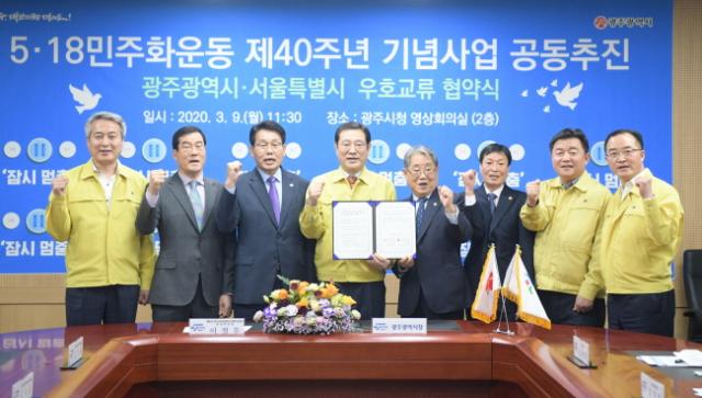 À̿뼷 ±¤ÁÖ½ÃÀå°ú ¹Ú¿ø¼ø ¼¿ï½ÃÀåÀº 9ÀÏ ¿ÀÀü ±¤ÁÖ½Ãû ¿µ»óȸÀǽǰú ¼¿ï½Ãû ¿µ»óȸÀǽǿ¡¼ È»óÀ» ÅëÇØ ¡®5¡¤18¹ÎÁÖȿ Á¦40Áֳ⠱â³ä»ç¾÷ ±¤ÁÖ±¤¿ª½Ã-¼¿ïƯº°½Ã °øµ¿ÁÖÃÖ ¾÷¹«Çù¾à¡¯À» ü°áÇß´Ù.