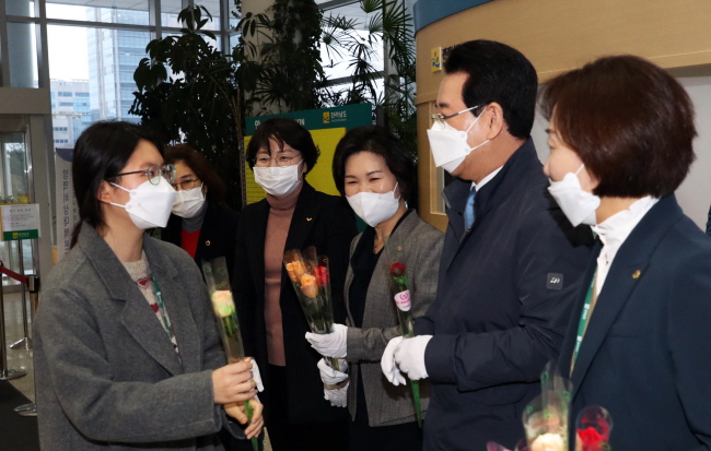 µµÃ»¿¡¼ ¸¶·ÃµÈ À̳¯ Çà»ç´Â Ãâ±ÙÇÑ Á÷¿øµé¿¡°Ô Àå¹Ì²É°ú ¶±À» ÁõÁ¤ÇÏ°í ¿©¼ºÆø·Â OUT, ¼ºÆòµîÇÑ Á÷Àå¹®È Á¶¼º µî ½½·Î°ÇÀ» ¿ÜÄ¡¸ç ¿©¼ºÀÇ ³¯ Àǹ̸¦ µÇ»õ±ä ½Ã°£ÀÌ µÆ´Ù.