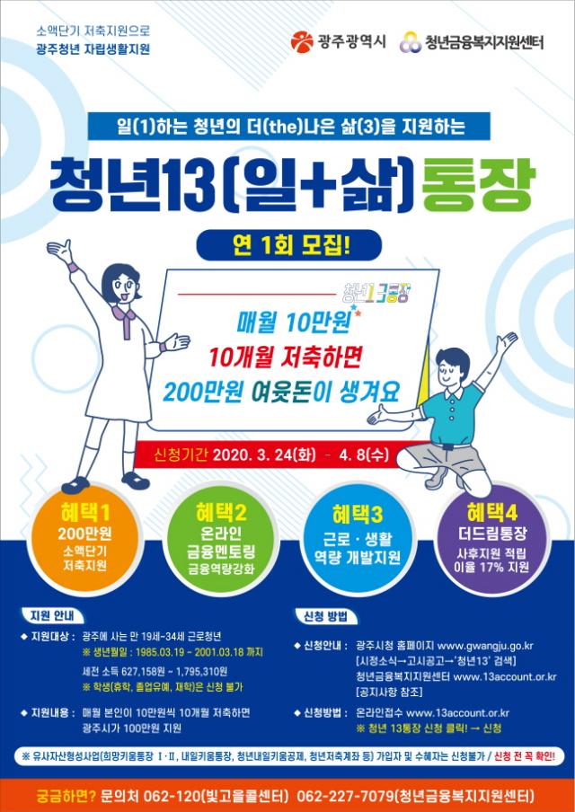 ¡®2020 û³â13(ÀÏ+»î)ÅëÀåÁö¿ø»ç¾÷¡¯ Âü¿©´ë»óÀº ±¤ÁÖ¿¡ °ÅÁÖÇÏ´Â ¸¸ 19¼¼ºÎÅÍ 34¼¼±îÁöÀÇ ±Ù·Îû³âÀ¸·Î, ¼¼±ÝÀ» Æ÷ÇÔÇÑ ÃÖ±Ù 3°³¿ù °£ Æò±Õ ±Ù·Î¼ÒµæÀÌ 62¸¸7158¿ø ÀÌ»ó 179¸¸5310¿ø ÀÌÇÏÀÌ¸é °¡´ÉÇÏ´Ù.