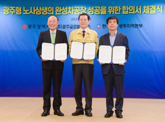À̿뼷 ±¤ÁÖ±¤¿ª½ÃÀå°ú ¹Ú±¤Å ¢ß±¤Áֱ۷ιú¸ðÅͽº ´ëÇ¥ÀÌ»ç, À±Á¾ÇØ Çѱ¹³ëÃÑ ±¤ÁÖÁö¿ªº»ºÎ ÀÇÀåÀº 29ÀÏ ¿ÀÈÄ ±¤ÁÖ½Ãû ºñÁî´Ï½º·ë¿¡¼ ¡®±¤ÁÖÇü ³ë»ç»ó»ýÀÇ ¿Ï¼ºÂ÷°øÀå ¼º°øÀ» À§ÇÑ ÇÕÀǼ¡¯¸¦ ¹ßÇ¥Çß´Ù.